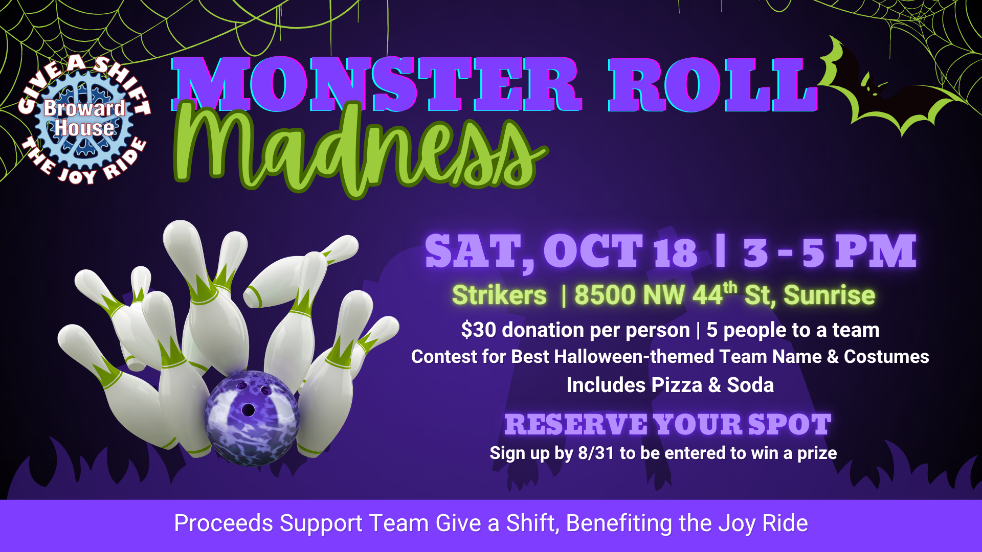 Strikers 8500 NW 44th Street, SunriseJoin Broward House's Team Give a Shift for a spook-tacular afternoon of madness benefiting the Joy Ride! Grab four friends and create your team. Pick a monstrous name and get your costumes ready! Sign up now to reserve your lane—$ 30 per person. Includes: 2 Hours of Bowling Pizza & soda for each lane Reserve your spot by 8/31 to be entered to win a prize. Get Your Tickets