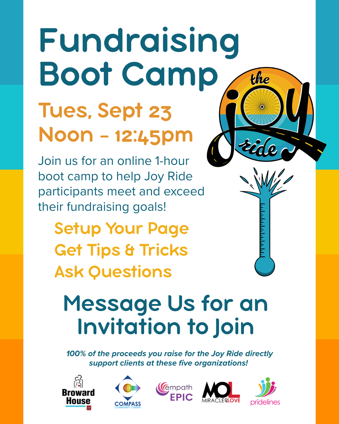 The ride is fully supported, ensuring that you’re never alone. The Joy Ride is a community-focused event, and we’re with you every step of the way to help you achieve your fundraising goals and complete the ride.